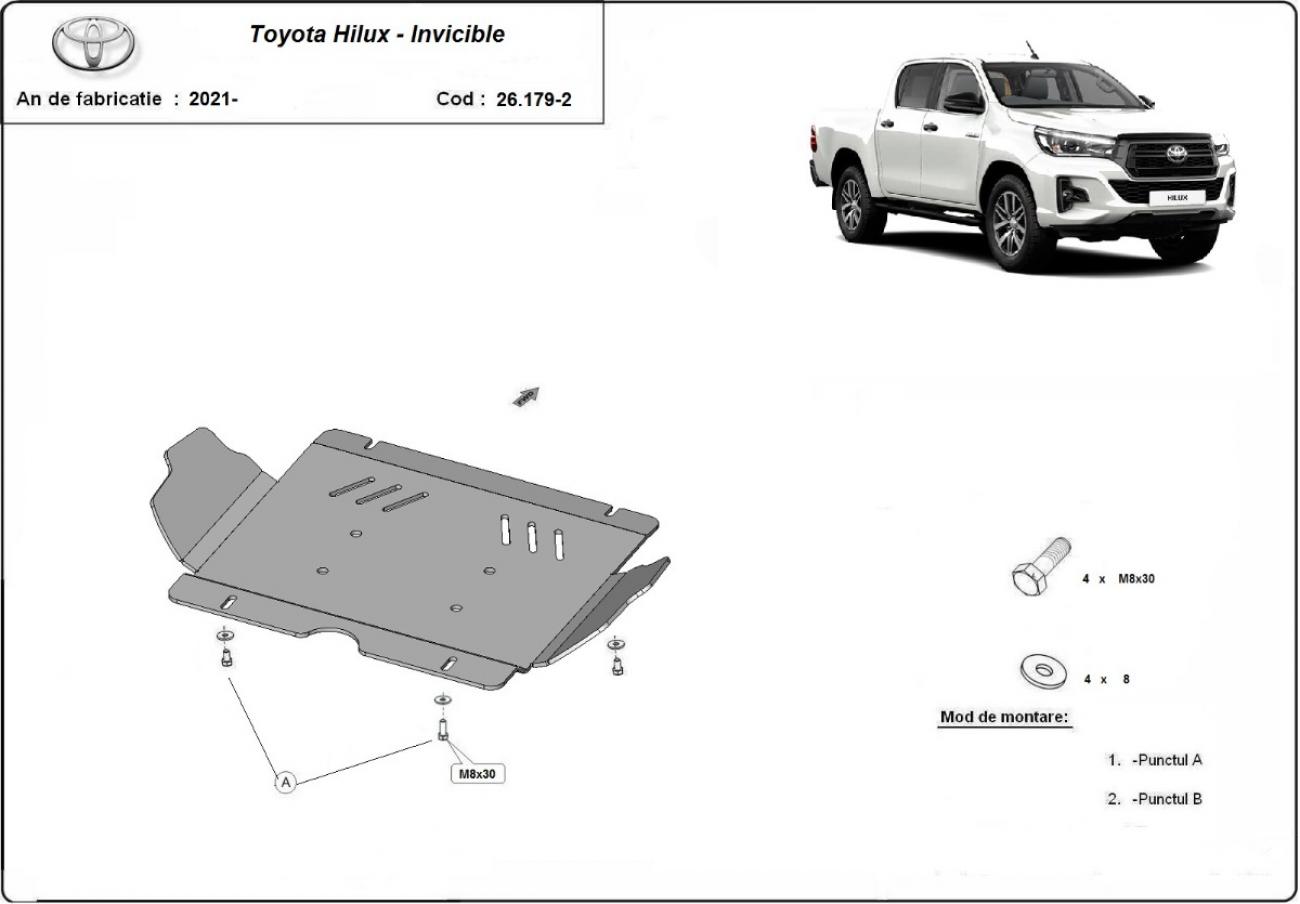 Marca: Toyota Model: Toyota Hilux Invincible An: 2021 – 2025 Material: Oțel Grosime: 3 mm Zona protejată: motor Motorizare: Toate