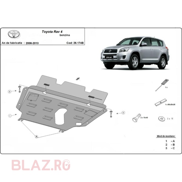 Marca: Toyota Model: Toyota RAV 4 An: 2006 – 2013 Material: Oțel Grosime: 2,5 mm Zona protejată: motor, cutie de viteză, radiator, bara față Motorizare: benzina
